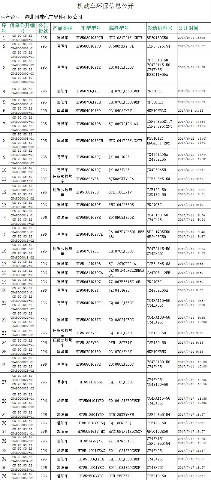 | 32 | CN ZC G5 Z2 0K48000032-01 CN ZC G5 Z2 0K48000032-02 | 296 | 加油車 | HTW5147GJYZ | ZZ1147G381CE1 | CY4SK151 ISF3.8s5154 | 2017/7/17 16:57 2017/7/17 16:57 |