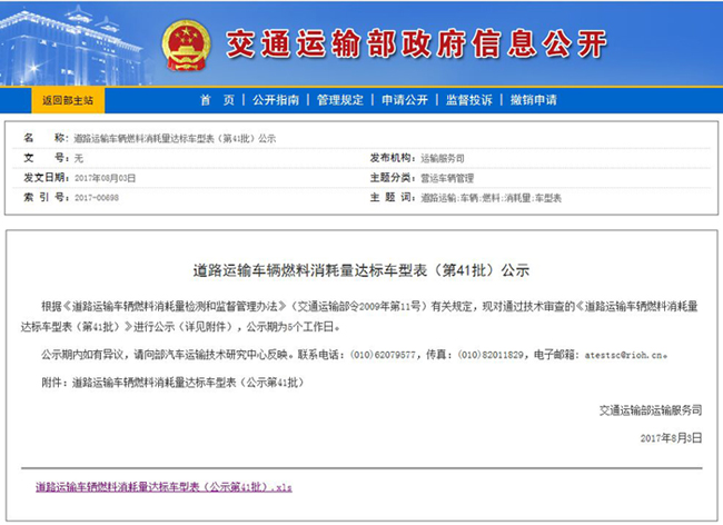 根據(jù)《道路運輸車輛燃料消耗量檢測和監(jiān)督管理辦法》(交通運輸部令2009年第11號)有關規(guī)定,現(xiàn)對通過技術審查的《道路運輸車輛燃料消耗量達標車型表(第41批)》進行公示(詳見附件),公示期為5個工作日。其中包括湖北同威汽車配件有限公司的5款車型,分別為HTW5040TQZPQ清障車,HTW5080TQZPJH清障車,HTW5110GJYEQ加油車,HTW5111GJYQ加油車,HTW5127GJYEQ加油車,具體公示內容請看下表。