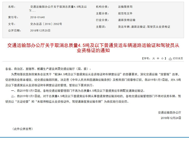 一、自2019年1月1日起,各地交通運(yùn)輸管理部門不再為總質(zhì)量4.5噸及以下普通貨運(yùn)車輛配發(fā)道路運(yùn)輸證。