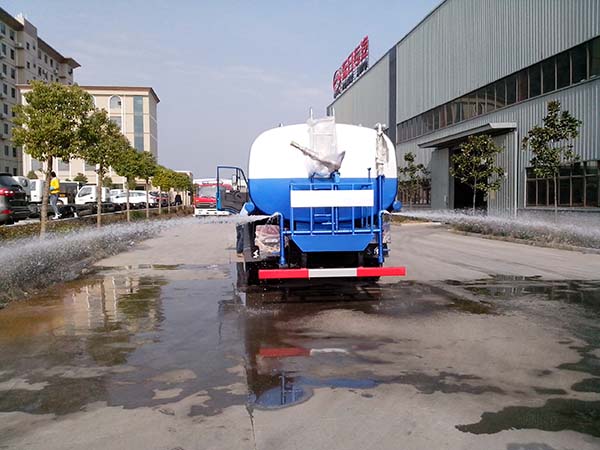 灑水車前裝有鴨嘴形噴嘴或圓錐形沖嘴,后面裝有圓柱形灑水噴嘴或蓮蓬頭噴嘴,后部有工作平臺(tái),裝配有水炮。后部還可裝8個(gè)噴嘴。