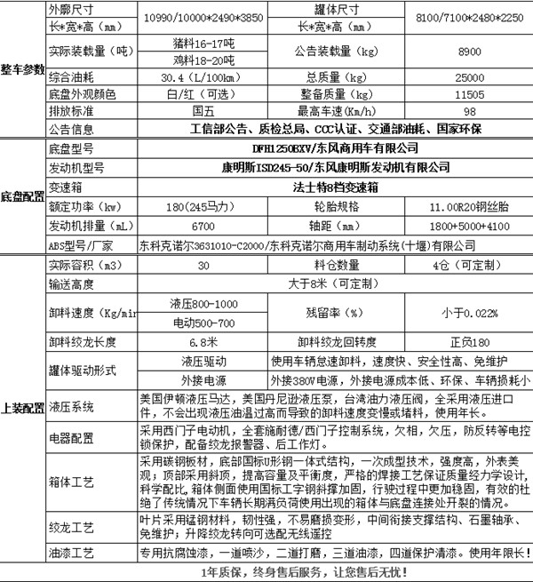 | 罐體外形尺寸:8000×2450×2250(mm),罐體有效容積:27.93立方米隨底盤選裝駕駛室;外形長(zhǎng)(mm)/軸距(mm)/后懸(mm)/離去角(°)對(duì)應(yīng)關(guān)系為”:10990/1800+5000/2760/11,10000/1800+4100/2670/12;防護(hù)材料:Q235,連接方式:側(cè)后防護(hù)均采用焊接連接,后部防護(hù)斷面尺寸(mm):120×60,后部防護(hù)離地高度(mm):450。安裝帶衛(wèi)星定位功能的行駛記錄儀。ABS生產(chǎn)廠家:東科克諾爾商用車制動(dòng)系統(tǒng)(十堰)有限公司;型號(hào):3631010-C2000.;發(fā)動(dòng)機(jī)與油耗值的對(duì)應(yīng)關(guān)系分別為:ISD210 50/33.7(L/100Km),ISD245 50/33.6(L/100Km),ISD210 50/33.7(L/100Km),ISD270 50/33.6(L/100Km),ISD285 50/33.5(L/100Km)。該車專用裝置為絞龍,飼料倉(cāng),用于運(yùn)輸散裝飼料,自卸方式:絞龍?zhí)嵘孕。選裝后部樣式。 |