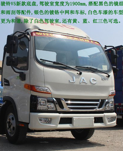 江淮駿鈴V5底盤型號(hào)HFC1045P92K2C2ZV,1900mm豪華寬體駕駛室,軸距3308mm,江淮五十鈴HFC4DA1-2D發(fā)動(dòng)機(jī)120馬力,7.00R16LT 8PR鋼絲胎,ABS,電動(dòng)門窗,中控鎖,原廠空調(diào),多功能方向盤,LED大燈。